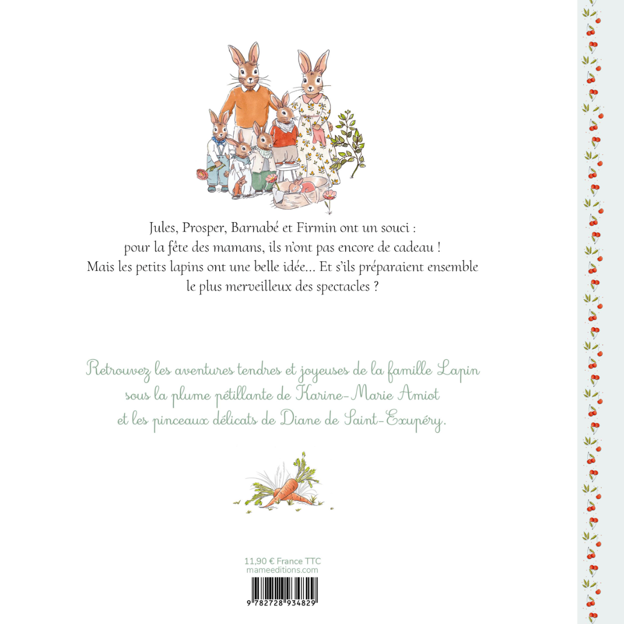Jules, Prosper, Barnabe et Firmin ont un souci : pour la fête des mamans, ils n'ont pas encore de cadeau ! Mais les petits lapins ont une belle idée... Et s'ils préparaient ensemble le plus merveilleux des spectacles ?